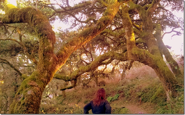 Steps away from open land, mossy trees cover the pathway.